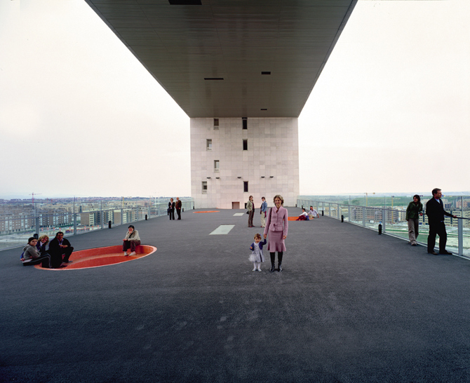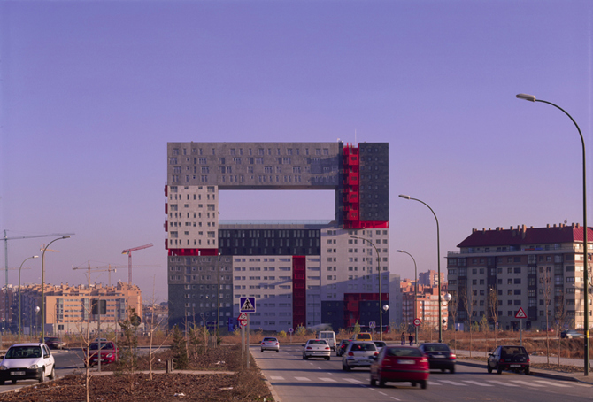 El volumen desarrollado en 21 plantas emerge como referente en un entorno excesivamente homogéneo, encuadrando el paisaje por medio de su mirador de 40 x 15 x 15 m situado en la planta 12. Este vacío abierto a la ciudad, al territorio y también al contexto mediático, es el patio vecinal. Al elevarse, la construcción libera un espacio público que la ciudad contemporánea demanda. Los 20.000 m2 construidos contienen una gran variedad de situaciones y 36 tipos de viviendas. Se organizan en nueve agrupaciones, representadas por nueve materiales de fachada: tres tipos de GRC, granito, caliza y pizarra, y tres tipos de materiales cerámicos de pequeño formato.