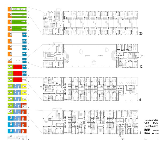 La diversidad de fachadas se materializa en un despiece variable, una organización de huecos cambiante, así como texturas y colores diversos; entre las nueve tipologías de cerramiento discurren los cuatro núcleos de circulación y los miradores intermedios que surgen con el cambio de dirección de las escaleras. Las circulaciones en el edificio son como pequeñas calles verticales. Sus transformaciones a lo largo de cada recorrido enlazan un compendio de tipologías estructuradas a modo de pequeños barrios.