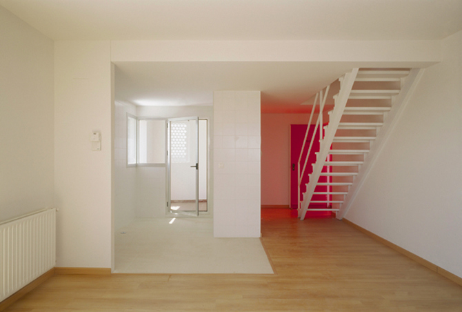 El gran vacío central aglutina la diversidad y da identidad al conjunto edificado. Contra la seriación y repetición racionalista de la unidad familiar tipo se plantea la variación razonable como respuesta a los nuevos modos contemporáneos de habitar. Se proponen múltiples unidades o alojamientos con organizaciones, flexibles y adaptables, ya que la estructura y las instalaciones se localizan en el perímetro de cada propiedad. Se trata de propiciar la identidad que cada habitante proyecta en su casa, la adecuación a un funcionamiento requerido y la incorporación a los cambios acelerados de la demanda.