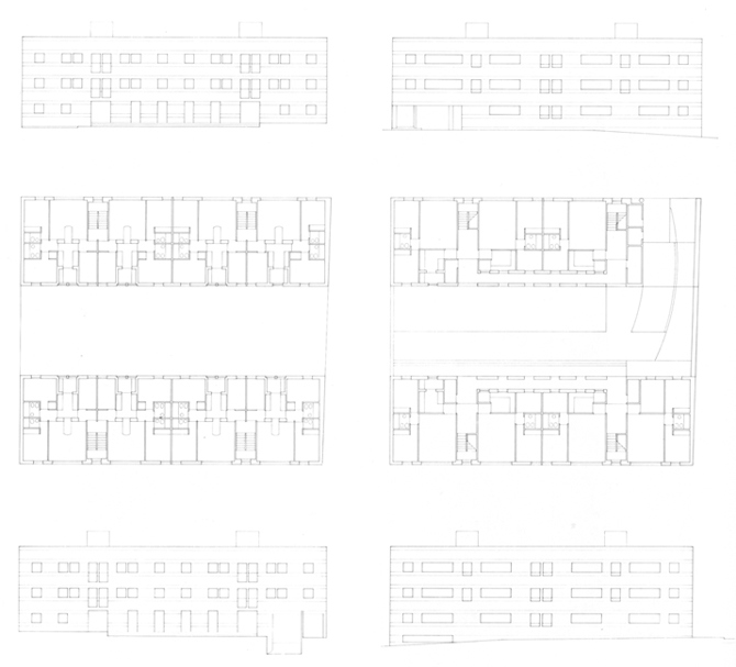 Esto nos lleva a crear dos bloques esenciales en donde se repite el tipo, con una gran sencillez constructiva y economía de medios. Se crea un espacio interno cerrado al entorno, por donde se accede a las viviendas, espacio plácido de relación, abierto y privado.