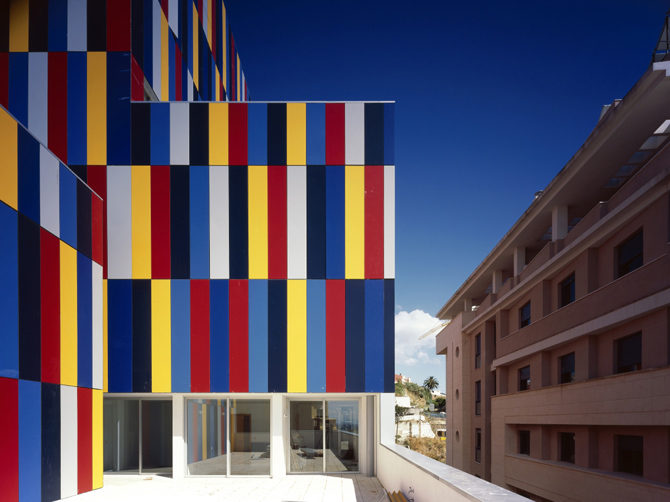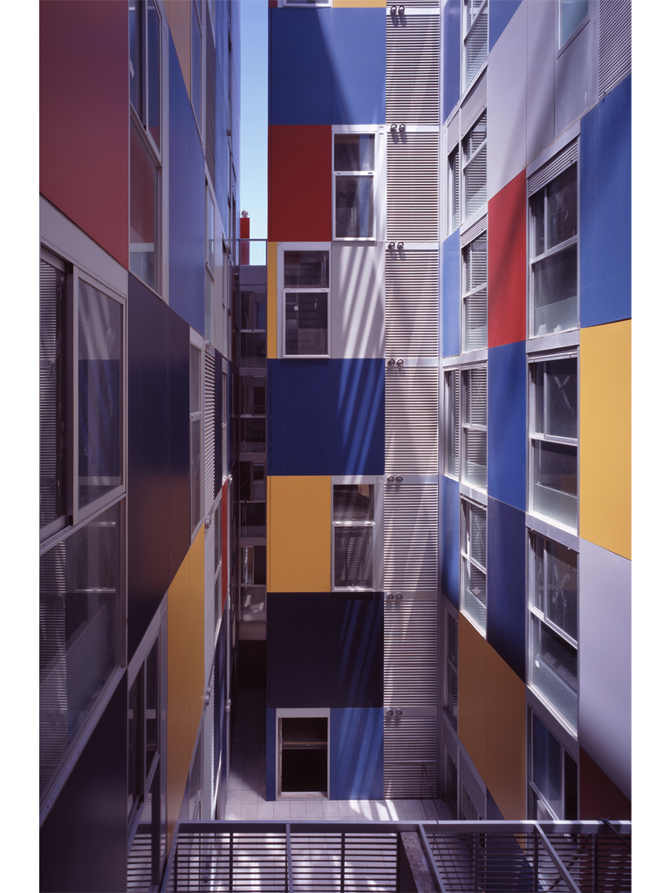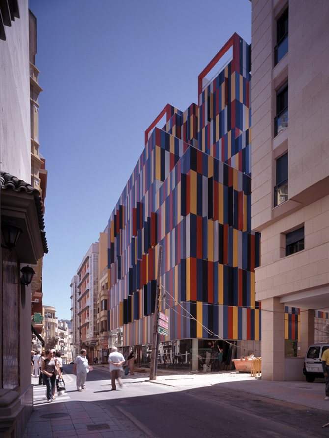 Así podría describirse que tiene tres vestíbulos, dos plantas de aparcamientos independientes, cuatro azoteas privadas, una pública, tres patios, y una relación numérica traducida de las Ordenanzas que hace variar la escala y proporción del edificio de cinco a nueve plantas de altura. Esta amalgama entre habitar y ciudad es el edificio mismo. La aleatoriedad de los colores y de la multiplicidad de posibilidades de aperturas o cierres de la piel manifiestan y exponen la vida del interior de los espacios domésticos.