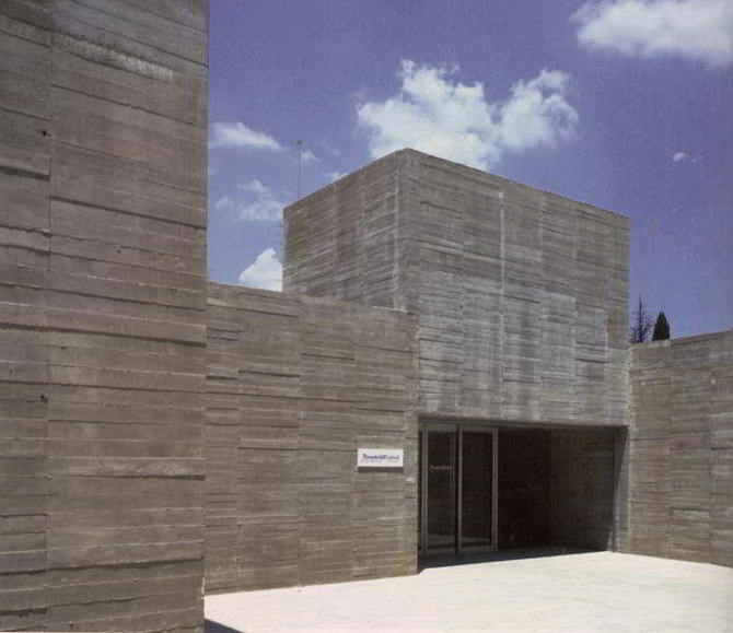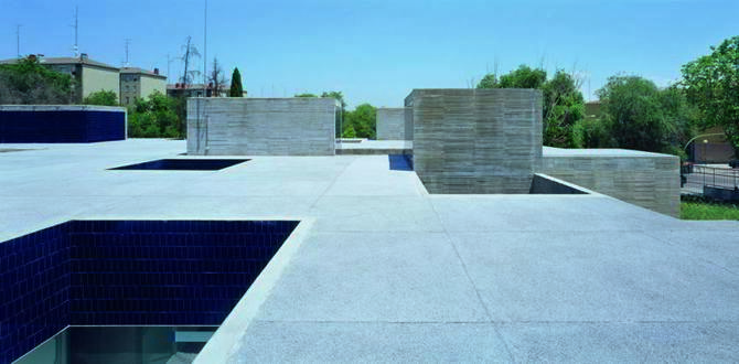 La inexistencia de huecos en los paños verticales de la envolvente exterior provoca que la relación interior-exterior del edificio se produzca verticalmente, casi con el firmamento. Los vidrios no definen patios, sino huecos en la fachada horizontal de la concha exterior del edificio, y se crea una relación vertical que permite generar un espacio interior isótropo. Las cualidades de transparencia y especulares del vidrio multiplican las visiones por simetría reflejada; así mismo las cualidades de reflexión de los paños verticales de azulejo azul colocado con juntas terciadas a modo de escama ayudan a producir un ambiente interior espacioso y luminoso, casi como si se introdujera el firmamento en el interior. El corredor se disuelve, deja de existir como estructura lineal de conexión tradicional, porque la ordenación alterna de espacios vacíos y estanciales de carácter público permite una relación débil entre las coordenadas “x” e “y” del espacio.