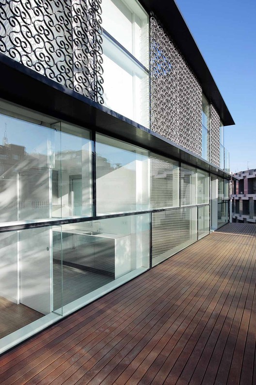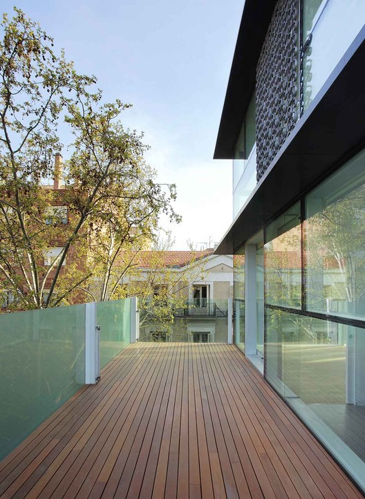Un edificio sobre los terrenos de las antiguas caballerizas del Palacio Coca en el centro de Madrid da pie a experimentar con los puntos de coincidencia entre la tradición de los miradores madrileños y un muro cortina permeable y protegido del sol, permitiendo conjugar en el interior el confort tradicional de las habitaciones encadenadas y con gran volumen, con la limpieza de los espacios contemporáneos y su fluidez interior-exterior.