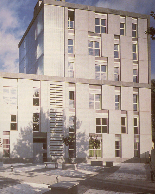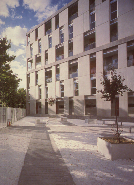Planteamos un edificio grande y pequeño a la vez. Frente al gran vacío urbano de las vías del ferrocarril, actuamos en un solar de reducidas dimensiones (la mitad de la cuarta parte de las manzanas cuadradas de la trama del ensanche). Nos interesa proponer un edificio pequeño de gran escala, ¿tiene seis o dos alturas? Esta ambigüedad responde a la presencia urbana que la edificación debe tener en este entorno y a la escala doméstica que la arquitectura debe manifestar. Una pieza continua, plegada, define un contenedor (gran escala) en el que se introducen los paquetes funcionales de las viviendas (pequeña escala). La piel que ocupa el vacío delimitado por la cáscara del contenedor se estructura con un módulo de 3 x 0,9 m que alternativamente será ventana o panel de cerramiento. La combinatoria de las dos unidades dibuja un mosaico en la fachada, una vibración cromática bajo los efectos de la luz del sol. De lejos percibimos una composición de teselas delimitada por el contenedor, de cerca apreciamos la secuencia hueco-macizo. La complejidad escalar se convierte en el principal recurso para lograr la tensión adecuada que permite enfrentarnos a la problemática que se plantea en este emplazamiento.