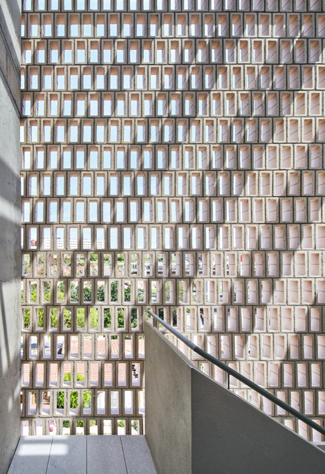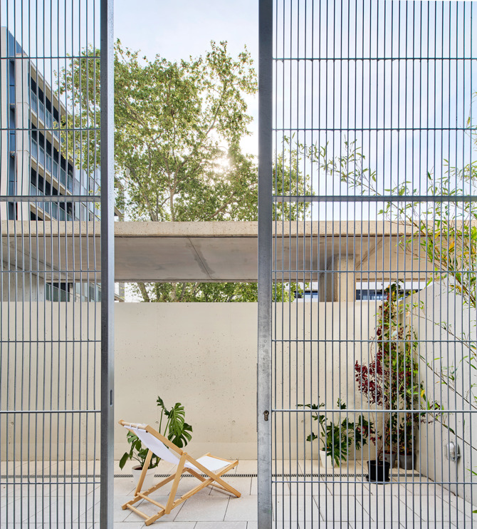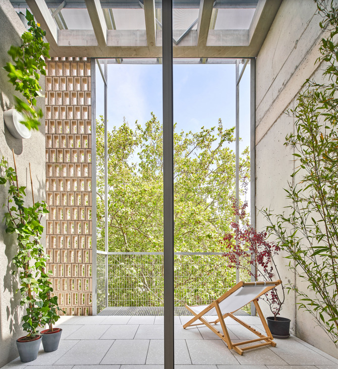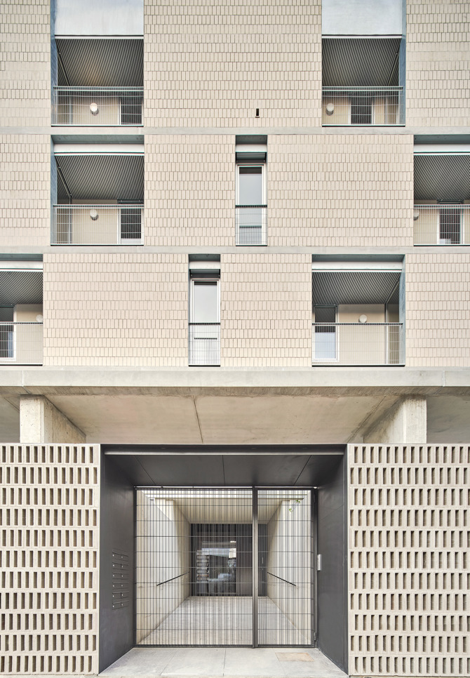 El sistema de balcones metálicos volados incorpora persianas enrollables y actúa como soporte de vegetación. En planta baja, las terrazas orientadas al parque se intercalan con los patios de ventilación del aparcamiento, generando un grosor a modo de filtro de intimidad entre el espacio público y la casa. El cerramiento de los patios orientados a la calle se desdobla para crear otra entrada de aire que permite la ventilación cruzada en el aparcamiento. El uso de la obra vista, como materialidad determinada por el planeamiento, supone una oportunidad para introducir celosías que permiten dar una textura porosa a la fachada del edificio.