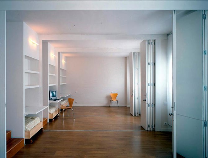 La cocina tiene una dimensión amplia y es posible conectarla con la sala de estar, pues se considera que es un elemento a valorar dentro de los nuevos hábitos domésticos. Así mismo, se propone un espacio cerrado y perfectamente ventilado como tendedero. El programa de viviendas es de 2, 3 o 4 dormitorios, que se pueden consolidar como un tipo estandarizado y de “no riesgo”, no elevando el pasillo y dejando fijas las paredes entre estancias. Pensamos que no es nada descabellado sino quizás demasiado.