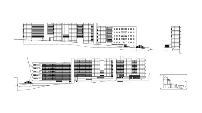 Los alzados de los bloques mantienen una gran uniformidad, haciendo destacar la volumetría del conjunto, con soluciones diferentes hacia la Carretera de Mata y hacia el barrio de El Polvorín. La fachada principal es la resultante de la disposición en peine que tienen los bloques con las pasarelas de interconexión, formalizándose patios paralelos y abiertos en sus extremos que favorecen la permeabilidad y relación visual entre ambos lados. La fachada posterior, de gran presencia por su posición elevada respecto al barrio, convierte las pasarelas, opaquizadas mediante lamas, en el elemento unificador de la composición.