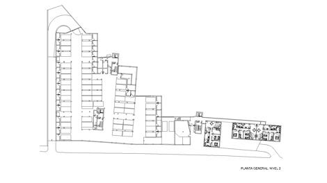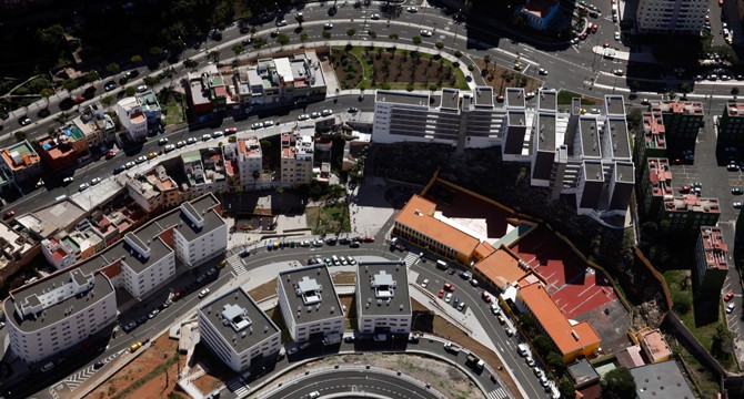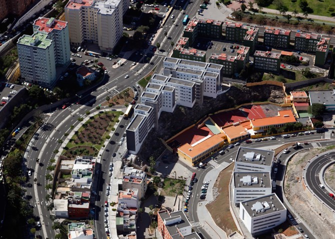 La parcela objeto del proyecto, entre la Carretera de Mata y el barrio de El Polvorín, tiene forma triangular, presenta una fuerte pendiente, con una diferencia entre cotas en sentido longitudinal de 7,20 m, y cuenta con una superficie total de 2.710,57 m2. Con objeto de resolver la gran diferencia de cotas existente entre los extremos de la parcela se realiza una planta sótano destinada a garaje (66 plazas de garaje y 40 trasteros) que ocupa la totalidad del solar y que se resuelve en dos niveles. Hacia el barranco este sótano presenta fachada, diseñándose como un zócalo que se adapta al contorno del barranco y que puntualmente se interrumpe con la aparición de los cuerpos de ascensores y escaleras.