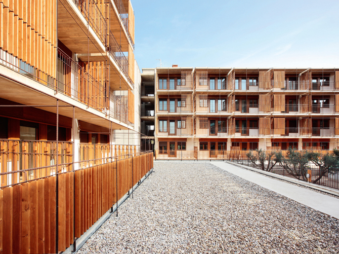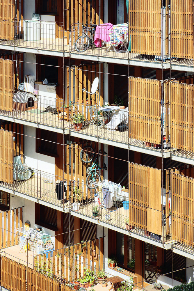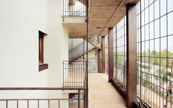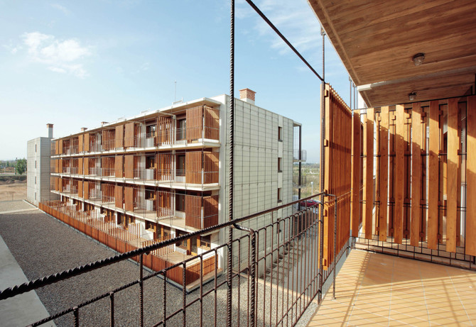 El coste de la obra se optimiza planteando un único tipo de vivienda. Este se articula alrededor de una pieza central donde se concentran las zonas húmedas y los pasos de instalaciones. Se trata de una vivienda que disfruta de dos orientaciones opuestas y que plantea una secuencia transversal de espacios: pasarela, vivienda y terraza, que la dotan de versatilidad y adaptación vinculadas al uso y a las circunstancias climáticas. La transición entre cada uno de estos espacios se plantea desde su propia condición, atendiendo a los parámetros de espacio, luz y temperatura. La terraza amplía el programa de la vivienda y dispone sombras y transparencias sugiriendo sistemas pasivos de control climático.