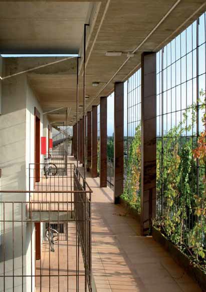 Diez viviendas por planta se distribuyen en cada uno de los dos edificios, de planta baja más tres. Un ligero talud permite la entrada de luz y aire natural al aparcamiento. En este plano inclinado se planta un pequeño bosque de chopos para que en verano proteja del sol de poniente. Los accesos y los espacios comunitarios se proyectan como lugares de relación, zonas intermedias entre las viviendas y el espacio exterior. Así, en la pasarela, una malla de acero corrugado responde con más o menos densidad a las necesidades del programa (barandillas, celosías, balcones, riego gota a gota, etc.) pudiendo acoger colonizaciones vegetales que sumadas a los chopos refrescarán unos espacios que por su orientación serán muy apreciados en las estaciones cálidas.