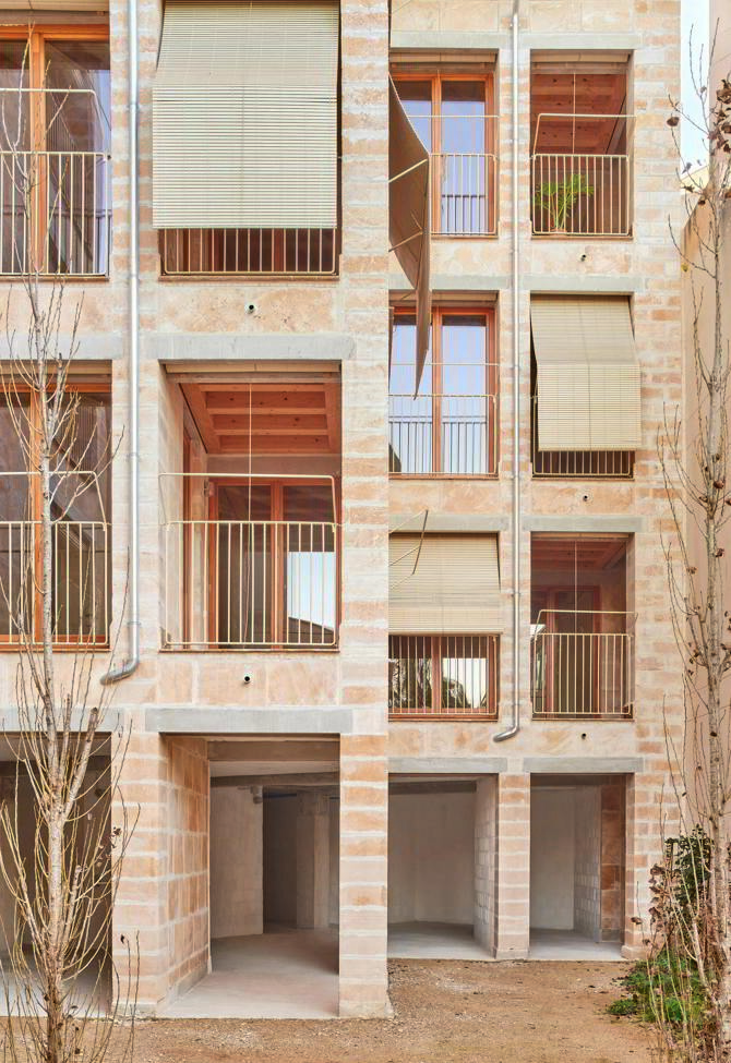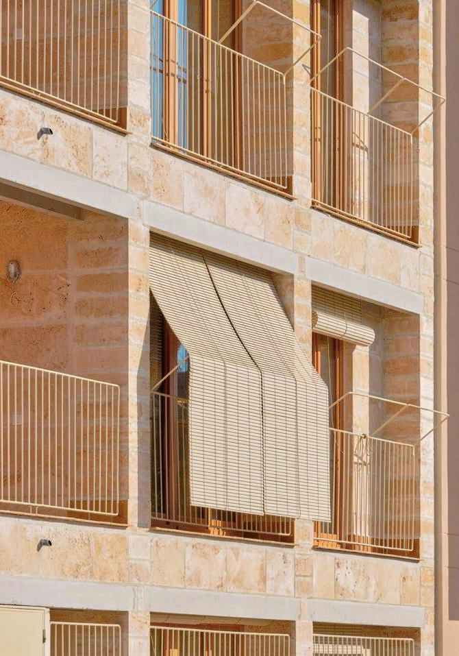 La cerámica y la piedra de marés son dos materiales locales con una larga tradición constructiva en Mallorca. La principal complejidad del proyecto radica en la combinación de dos sistemas constructivos que adoptan roles muy diferenciados. La cerámica conforma el grueso del edificio y desempeña una labor estructural y de compartimentación, mientras la piedra de marés remata el edificio enfatizando y dotando de expresividad los puntos singulares del proyecto.