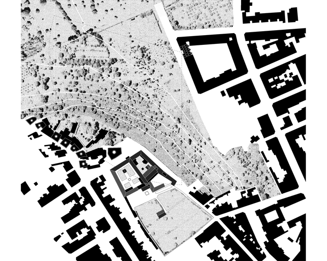 La parte posterior incorpora la forma oblicua del solar girando el edificio en busca de los rayos matutinos y las visuales largas. Finalmente, se aprovecha la diferencia de nivel entre la calle y el solar para crear un porche comunitario vinculado al patio de manzana, con trasteros y aparcamientos para bicicletas.