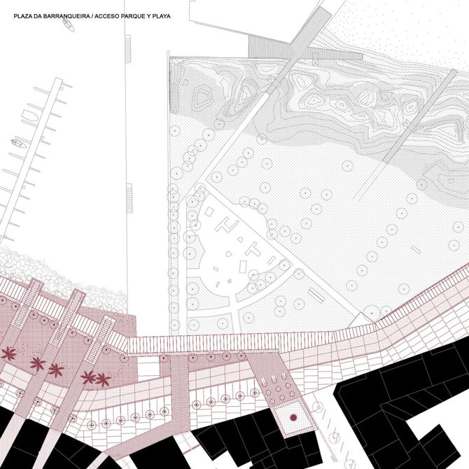 Antiguos y nuevos lugares revalorizaron este proceso de interconexión con nuevas lecturas, más allá de la estrictamente funcional. O Cruceiro fue recuperado como espacio de entrada y sugerido como mirador arbolado. El muro de contención se aprovechó como paseo. La urbanización, pautada en pavimentación y arbolado, facilita nuevos usos, repensar el significado del espacio. Hormigón devastado, piedra y tierra son ahora texturas que prolongan las calles del interior hasta el mar. Se suman escalones, gradas y balcones.