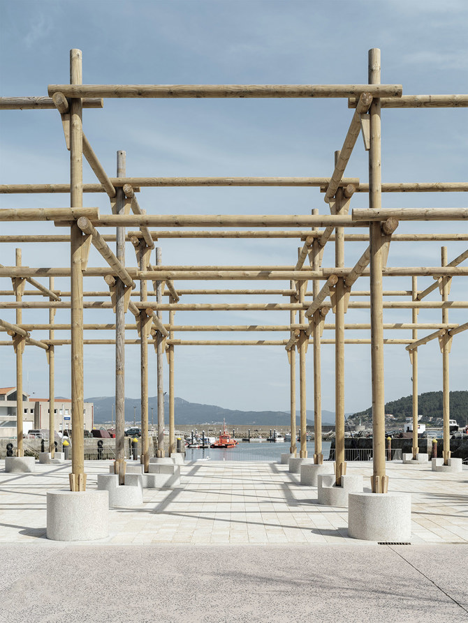 Cerca del mercado, una estructura de postes y vigas de madera devuelve la memoria de los secadoiros de redes como soporte de actividades ciudadanas, desde cine y exposiciones a conciertos, mercado y otras futuras. Dos grandes superficies complementan la fiesta: una libre, de piedra, y otra arbolada, sobre tierra. El paseo de borde continúa, con servicio a los pantalanes; luego, un aparcamiento y, en la zona final, el nuevo club náutico, cuya forma aprovecha el espaldón como pared para darle fin, creando un mirador hacia el monte Louro y la ría Muros-Noia.