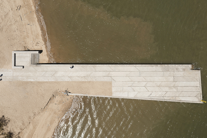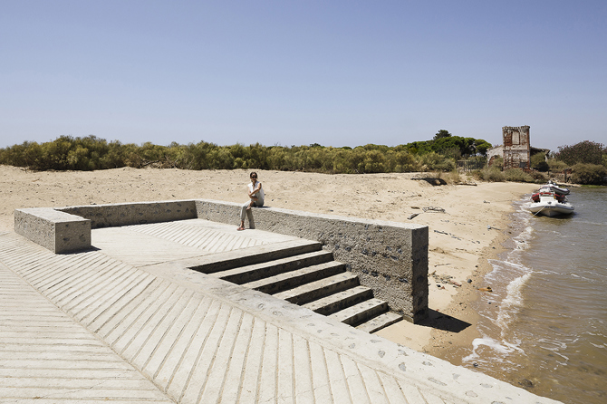 La tercera intervención en el ámbito del Real de la Almadraba permite habilitar un camino accesible entre las dos márgenes de la Flecha. El alto valor paisajístico de este paraje natural protegido sugiere llevar a cabo una instalación reversible mediante un camino peatonal de madera que va introduciéndose en la espesura arbustiva de retama y chumbera. La geometría de esta pasarela resulta de salvar los dos potentes cordones dunares que anteceden al océano Atlántico, evitando así fuertes movimientos de tierra que alteraran el paisaje existente y pendientes excesivas que impidieran el acceso de personas con movilidad reducida.
