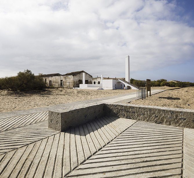 Por último, las redes pasaban a la nave escurridero, donde se dejaban secar y se recuperaba el alquitrán fundido sobrante a través del suelo acanalado, remedado ahora en el embarcadero. La rehabilitación se ha llevado a cabo con piezas cerámicas de acarreo encontradas en el lugar y con morteros de cal y pintura al silicato que favorecen la transpiración de las fábricas y dota al conjunto de una apariencia que remite a su estado original, donde los volúmenes blancos, cuya geometría depurada devenía de su uso estrictamente funcional, destacaban en el paisaje.