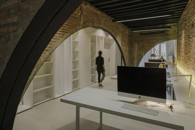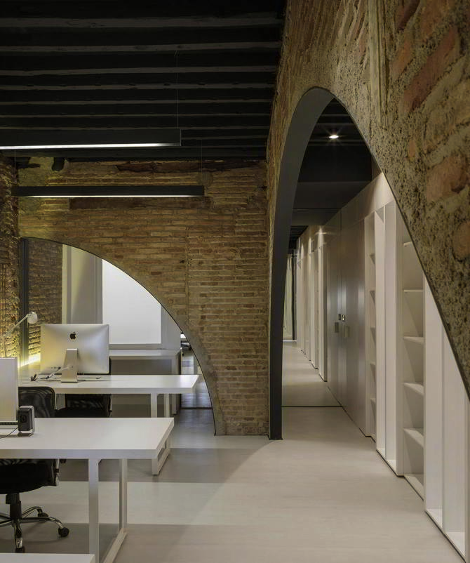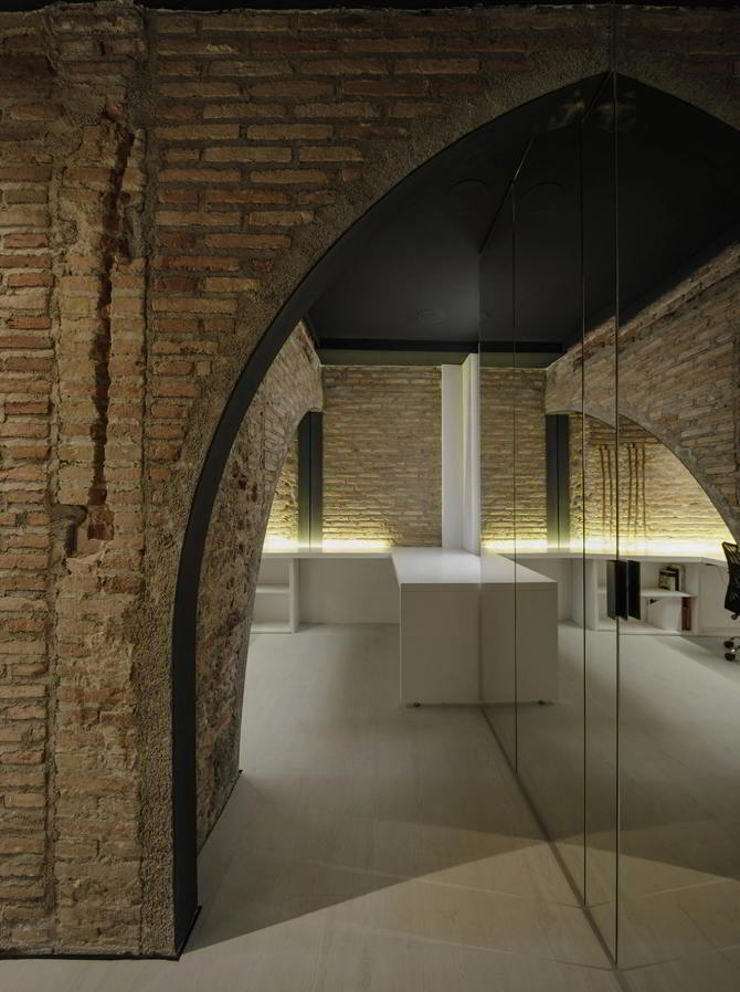 El proyecto para la nueva oficina de la agencia de comunicación Babydog se organiza en torno a un muro de carga convertido en arcada. Se trata de un espacio de trabajo situado más allá de los límites de la sucesión de relatos y tiempos superpuestos que encontramos al entrar en una antigua vivienda.