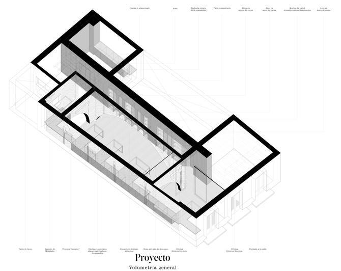 Una infraestructura continua, un mueble desplegado por el suelo y la pared terminaría de dotar al espacio de los servicios necesarios para el uso de oficina, actuando como elemento de almacenaje, escritorio, estantería, contraventana y línea de distribución para las instalaciones de luz y aire.