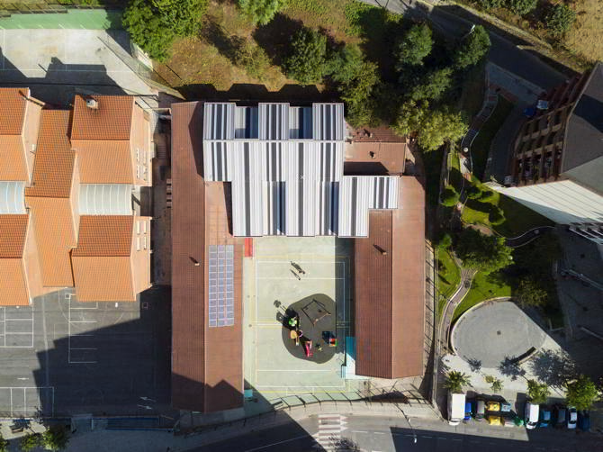 Exteriormente, la intervención reduce la superficie de porche. Para paliar esta merma, la cubierta de la alineación oeste se proyecta en vuelo de manera que se recupera la superficie exterior cubierta y se incorpora una doble puerta en la sala de psicomotricidad para conectarla directamente con el porche cubierto y aumentar las posibilidades de uso flexible del conjunto.