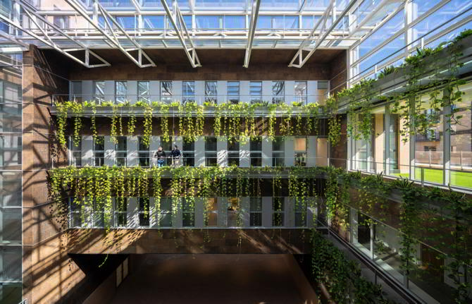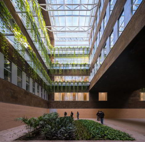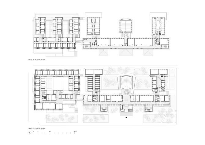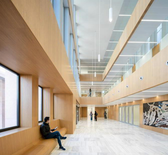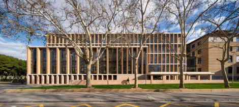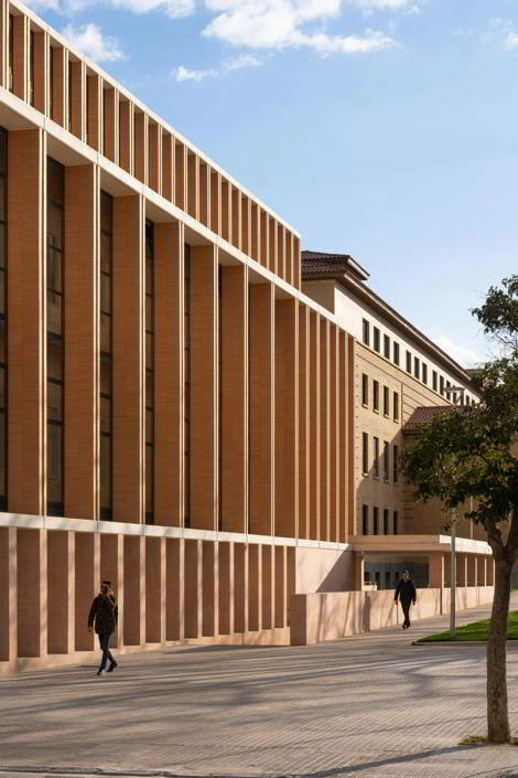 El nuevo edificio departamental anexo prolonga la facultad por el noreste, hasta el pórtico de acceso principal al campus. Su volumetría dialoga con las alturas del contexto y responde a la continuidad con el cuerpo longitudinal del edificio histórico. La sección hacia la calle genera una terraza-mirador. La disposición en planta, que varía de la forma de anillo de las plantas inferiores a la organización en peine de las superiores, genera en el interior una plaza cubierta, atravesada entre los lucernarios por el cuerpo central de despachos. La luz cenital que procede de las cubiertas vidriadas y la vegetación que se descuelga desde las plantas superiores caracterizan este espacio colectivo. La fachada exterior está compuesta por una sucesión de pilastras de ladrillo, entre losas horizontales de hormigón blanco. La tectónica adintelada de las fachadas evoca la construcción como apilamiento de elementos simples. La posición de las carpinterías tras las pilastras otorga espesor, profundidad y sombra a las fachadas. En las cámaras, las fachadas interiores son de placas de corcho, como aislamiento térmico visto.