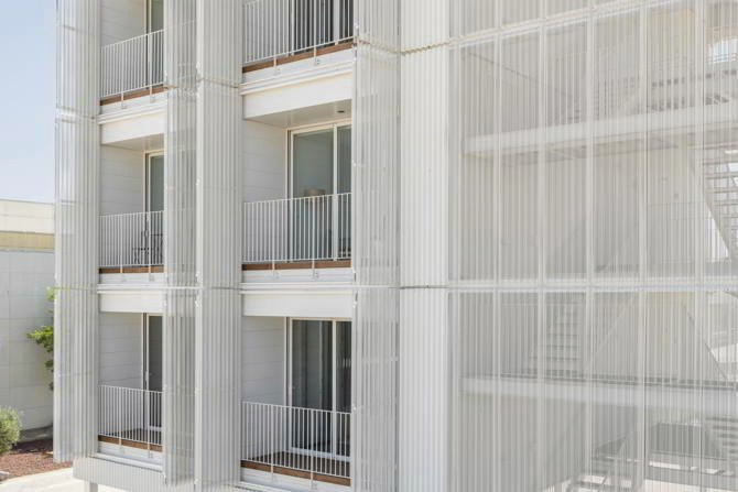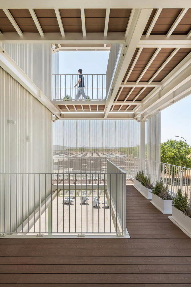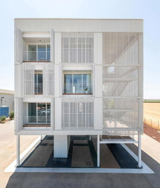 Cada módulo funciona de forma autónoma, lo que facilita su mantenimiento, renovación o sustitución sin afectar al conjunto. La envolvente exterior, diseñada para proteger del soleamiento y vincular el edificio con su entorno, actúa como una piel que integra progresivamente lo construido con el paisaje, especialmente en contextos donde conviven lo industrial y lo agrícola.