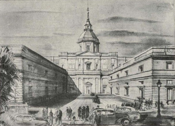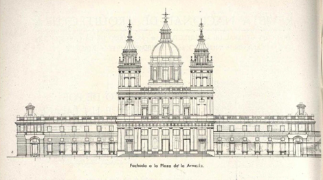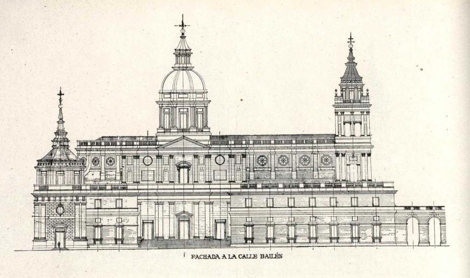 A toda la edificación nueva que nosotros proponemos, evidentemente la hemos cambiado de sentido, y no digamos de estilo, pero respetando todo lo hecho y fundiéndolo con la nueva obra. En síntesis y en grandes líneas, en cambio, de traza clásica. Solo así podíamos lograr la armonía apetecida con el gran palacio. Pero es más, esta misma armonía obligaba a tener en cuenta la relación de alturas de las dos edificaciones, palacio y catedral, para que la continuidad de las líneas horizontales no se rompiera. A ello obligaba más todavía el emplazamiento de la catedral, situada a la par de palacio en la vertiente del Manzanares y, por consiguiente, en un lugar señalada de la típica silueta madrileña, que últimamente se ha venido llamando fachada de Madrid.