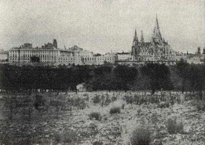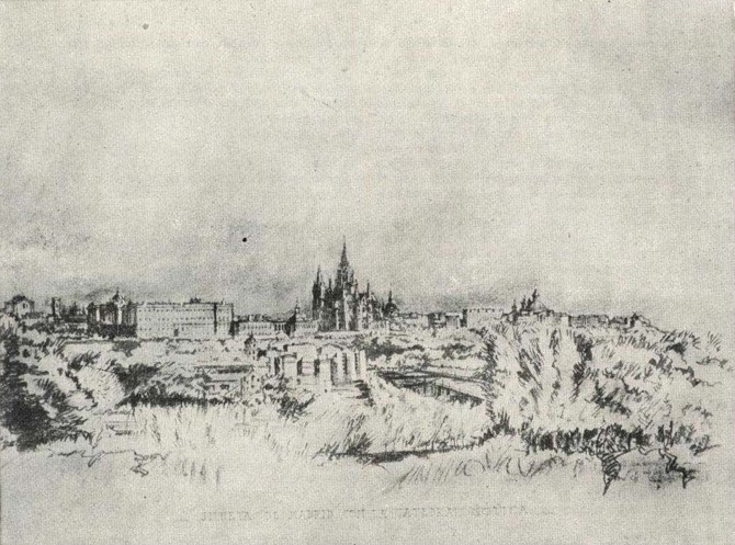 En este mirador tan comprometido hubiera sido un grave desacierto el asomar una catedral gótica de gran altura, con puntiagudas flechas y colosal cimborrio, que rompería no solo por la disparidad de estilo, sino por la mera silueta y altura, la línea graciosa del perfil madrileño, que sigue unas dilatadas horizontales, interrumpidas solo de vez en vez por la curva armoniosa y llena de las cúpulas madrileñas. Así, pues, teniendo en cuenta este grave problema de las alturas, hemos rebajado la nave del templo hasta someterla a la imperiosa horizontal de palacio.
