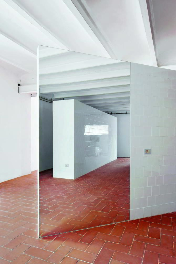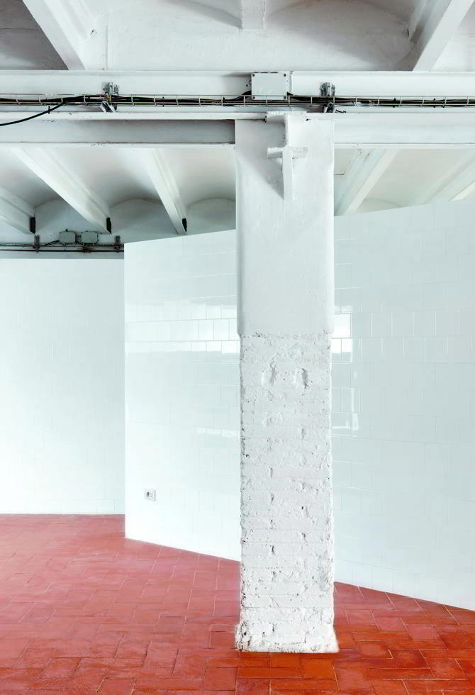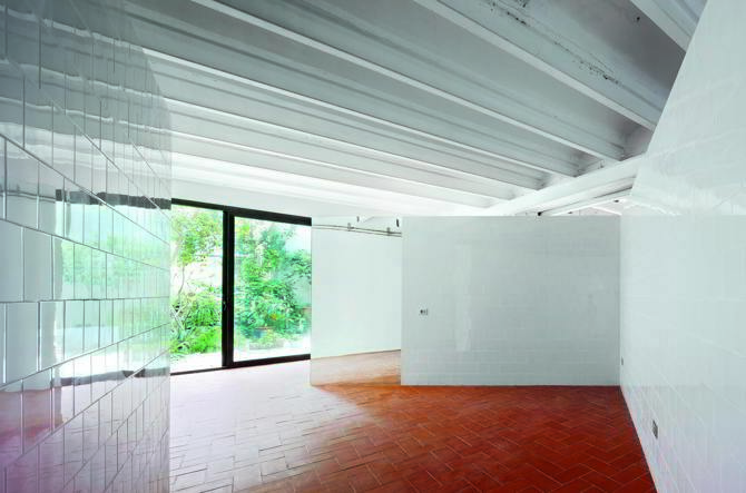 Se trataba de un encargo sencillo en el que las necesidades esenciales de la casa se reducían a la mínima expresión. La nueva vivienda debía contar tan solo con un lugar para dormir, un espacio para cocinar y un baño. Debido a las limitaciones de presupuesto se concentraron todos los esfuerzos y recursos en unas pocas decisiones estratégicas de gran impacto y coste reducido. Se decidió construir únicamente un tabique divisorio en forma de L y un armario ambos revestido mediante azulejos blancos brillantes, dispuestos de tal forma que articulan el interior dando respuesta a los requisitos del programa de forma clara y efectiva. Esta sencilla operación, que separa los espacios sin llegar a dividirlos completamente, simplemente creando pequeños rincones y áreas más abiertas, resultó ser un escenario perfecto para acoger numerosos y variados eventos y fiestas celebrados durante los años en los que el cliente habitó la casa. Además, se abrió una nueva ventana hacia el jardín, simétrica respecto a la que ya existía, y para el pavimento se optó por un revestimiento de baldosas cerámicas rojizas en contraste con el blanco de paredes y techos.