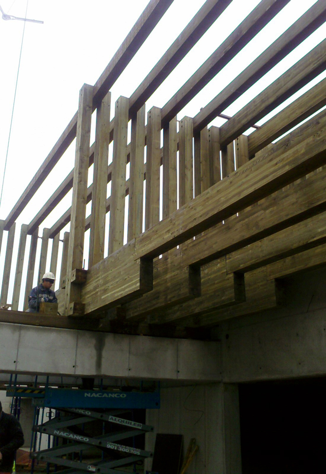 Marcos de madera laminada, voladizo mixto de madera y acero, con anclajes pretensados