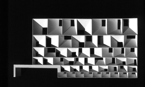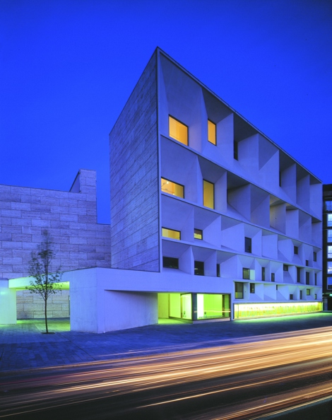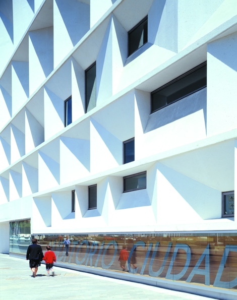 La fachada se construye como un apilado de ventanas en el que aparecen dos órdenes diversos: el perímetro de los huecos; y el hueco de cada ventana, fruto de las necesidades del interior.