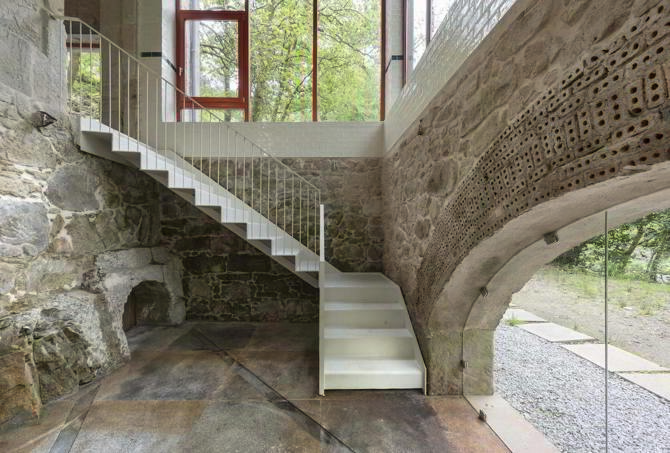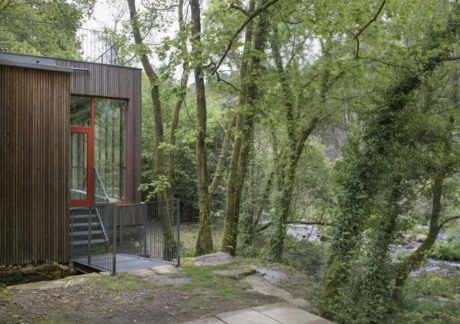 El propio lugar actuó como cantera, punto de extracción para todos los elementos de piedra que están construidos en el entorno del río, la central eléctrica, los molinos, los muros, los puentes, todo es de granito. Como toda arquitectura tradicional se construye con el material del propio lugar. Esto fue una base clara el abordaje del proyecto y de la obra, trabajar con materiales puros, y duraderos, tratando de simplificar al máximo el número de materiales de obra para optimizar económicamente todos los recursos.