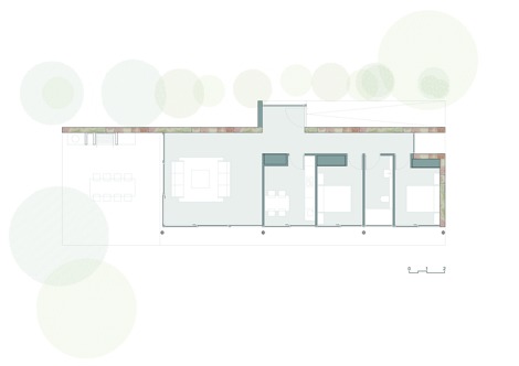 La vivienda se formaliza en una sola planta, y toda ella se estructura a través de un eje longitudinal, un muro de bloque cerámico de baja densidad a través del cual se va desarrollando todo el programa: el visitante lo recorre exteriormente hasta acceder al acceso principal, le acompaña en todo el interior de la vivienda y culmina en el exterior.