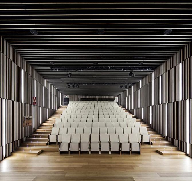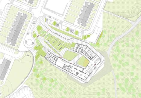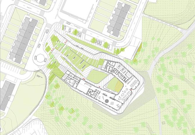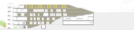 Por esta condición dual el edificio se aprovecha del desnivel de la ladera para organizar su programa funcional de arriba abajo, colocando las partes públicas del programa en la planta de acceso y favoreciendo la especialización del programa según vamos bajando, es decir, adentrándonos en el edificio.