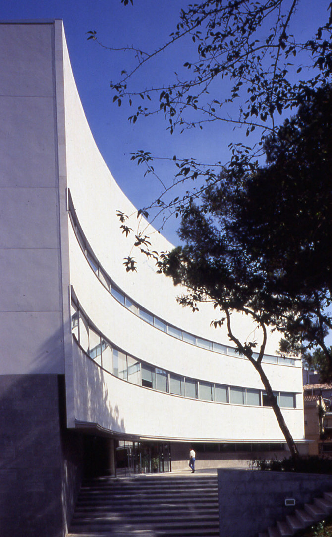La implantación del edificio se organiza a lo largo de una medianera, dando fachada sobre un gran espacio. La fachada principal se convierte en el verdadero identificador de la imagen del edificio. Su forma curva tenderá a plantear un nuevo límite al espacio urbano delantero y, por su orientación, conseguirá reflejar luz hacia la plaza, con lo que se conseguirá un espacio abierto con mejores condiciones ambientales.