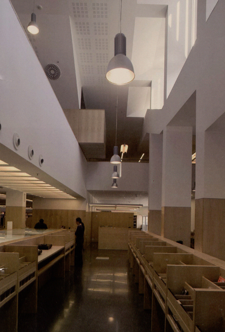 El primer caso se intenta fundir el otro volumen de la biblioteca con el de edificios posteriores. Este objetivo se traduce en la planta al definir su límite con una geometría romboidal que completa el volumen iniciado por estas edificaciones; con esta operación la biblioteca se enfrenta a la gran superficie abierta que significa la Plaza Lesseps desde la escala y protección que le da el volumen que forman los edificios ya mencionados.