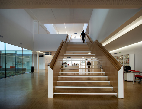 Por otro lado, el edificio responde plenamente a los nuevos retos programáticos de lo que hoy en día significa una biblioteca, un lugar de interacción social, pero al mismo tiempo reivindica su papel tradicional como biblioteca, como lugar de lectura, estudio y reflexión, introspectivo y tranquilo.