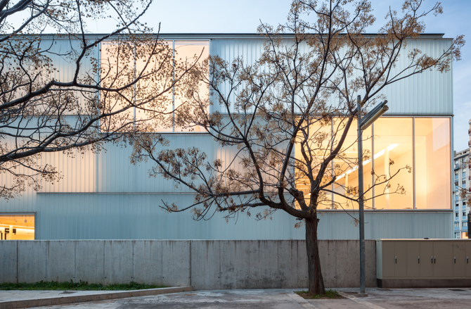 Por un lado, una geometría abstracta, un volumen puro y rotundo, un cuadrado perfecto, que determina sin lugar a dudas su carácter de edificio público y cívico, diferenciándolo del tejido residencial que lo envuelve.