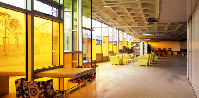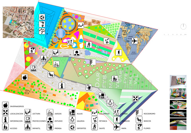 Situado en el borde suburbano de Torre Pacheco, el proyecto transforma el típico concepto de biblioteca como espacio silencioso de almacenamiento y consulta de libros en un dinámico centro comunitario multifuncional. Todo el solar se pliega en formas triangulares con la biblioteca insertada en la topografía.