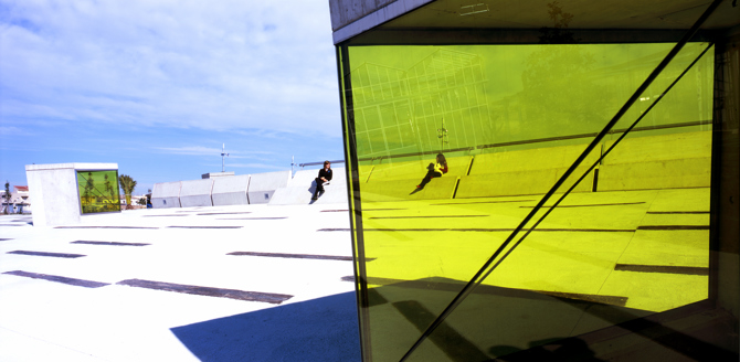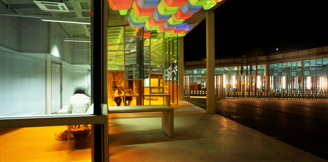 El color se introduce en el interior, principalmente de hormigón, con paneles de vidrio verdes, azules y naranjas, diversos elementos de mobiliario y las luminarias.