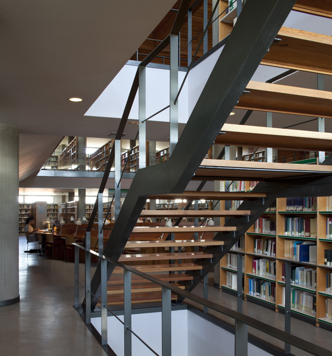 La biblioteca, que adquiere así una posición de hito urbano, es un edificio voluntariamente hermético, cuya función apenas se adivina desde el exterior. Se trata de una biblioteca organizada según el modelo anglosajón, en la que las áreas de almacenamiento de libros y de lectura están interrelacionadas. La idea central del proyecto se basa por tanto en una superposición en altura de espacios herméticos entre sí: la sala de acceso y de pasos perdidos, la sala de lectura y almacenamiento –un espacio unitario de seis plantas con circulaciones interiores por escaleras–, y la planta de cafetería y administración. Dos núcleos de comunicación comunes dispuestos diagonalmente permiten el acceso a los distintos niveles y espacios.
