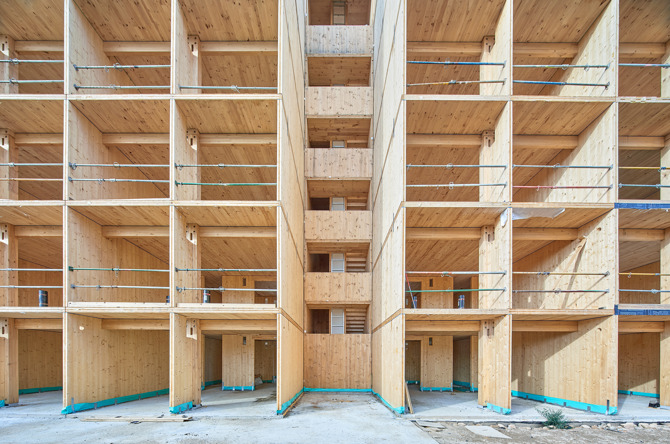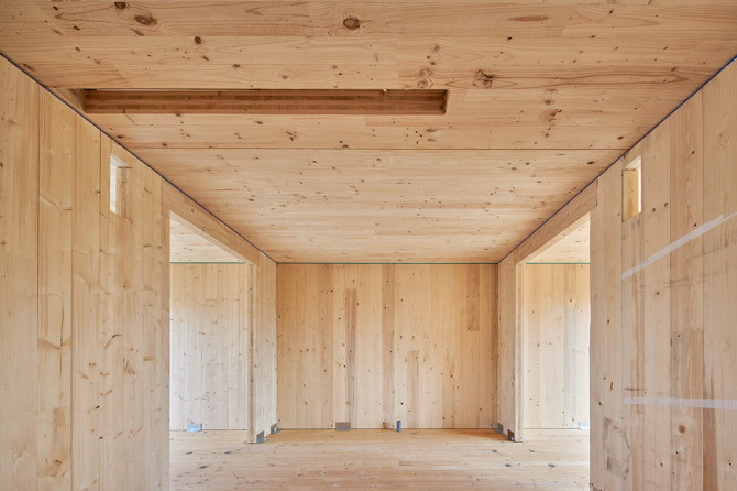 El uso de paneles de madera contralaminada (CLT) recupera el tipo de estructura muraria tradicional y determina unos espacios habitables de dimensiones similares entre los elementos portantes. Las viviendas están compuestas por seis estancias de unos 12 m2 capaces de albergar múltiples usos, y que pueden unirse o segregarse a voluntad mediante un sistema de paneles deslizantes.