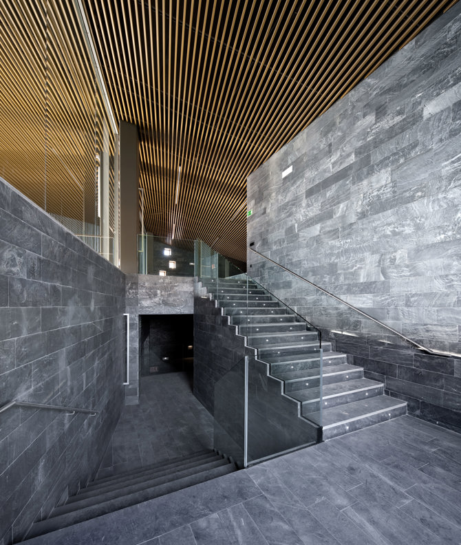 Los materiales del edificio acompañan estos cambios, pasando del exterior luminoso a los interiores de piedra oscura, en un recorrido didáctico que participa de todas las etapas de elaboración del vino.