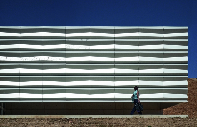 Piel exterior plisada de aluminio mate sobre basamento de hormigón macizo