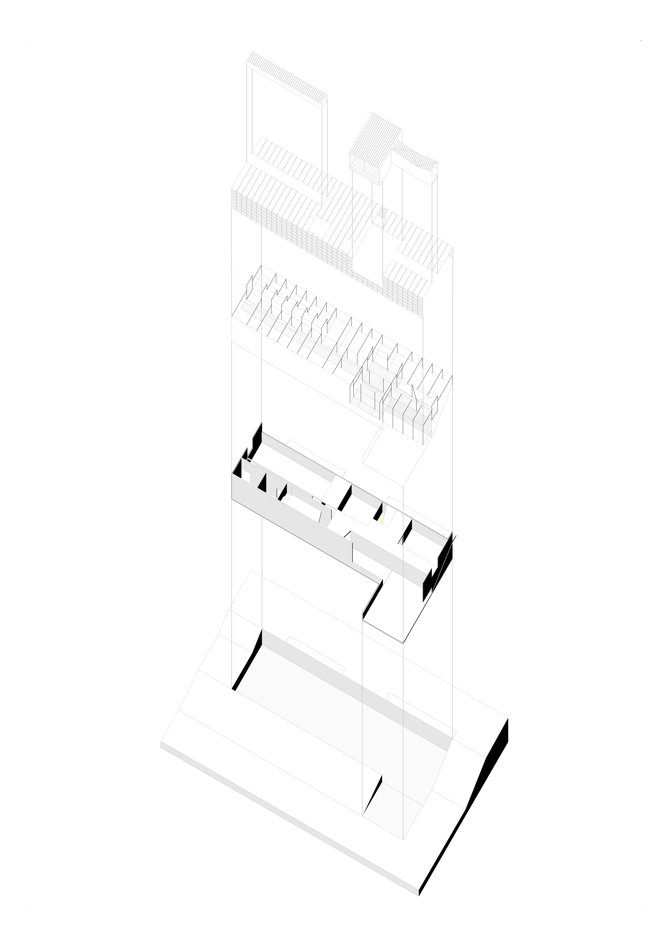 - La base se organiza en dos niveles, un nivel bajo de hormigón de carácter masivo y el nivel superior más ligero y metálico de carácter claramente tectónico.