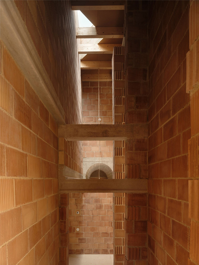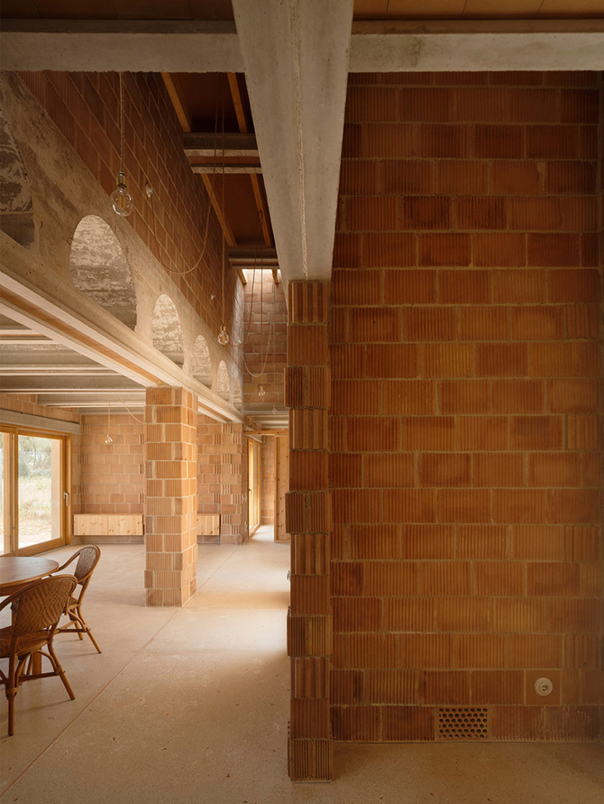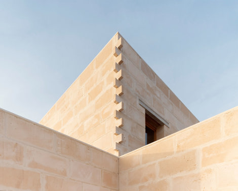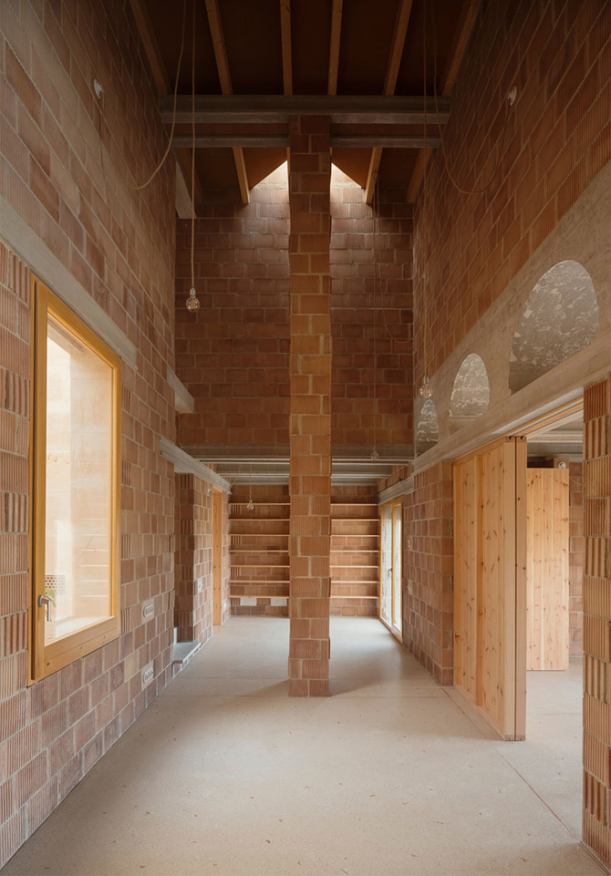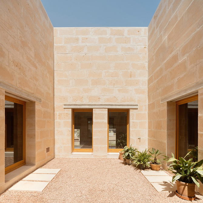 Se construye con dos hojas de materiales habituales, que representan los recursos locales más comunes de la isla. Actúan como dos capas de materiales que aportan inercia y un buen comportamiento higroscópico al edificio. La hoja exterior es de marés, la piedra arenisca que define el paisaje construido de Mallorca. La hoja interior es ladrillo cerámico producido con arcilla local. Ningún ladrillo se corta, ni siquiera en las esquinas. No hay residuos. La apariencia del aparejo es el resultado de la solución constructiva.