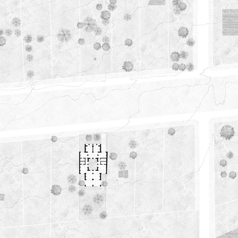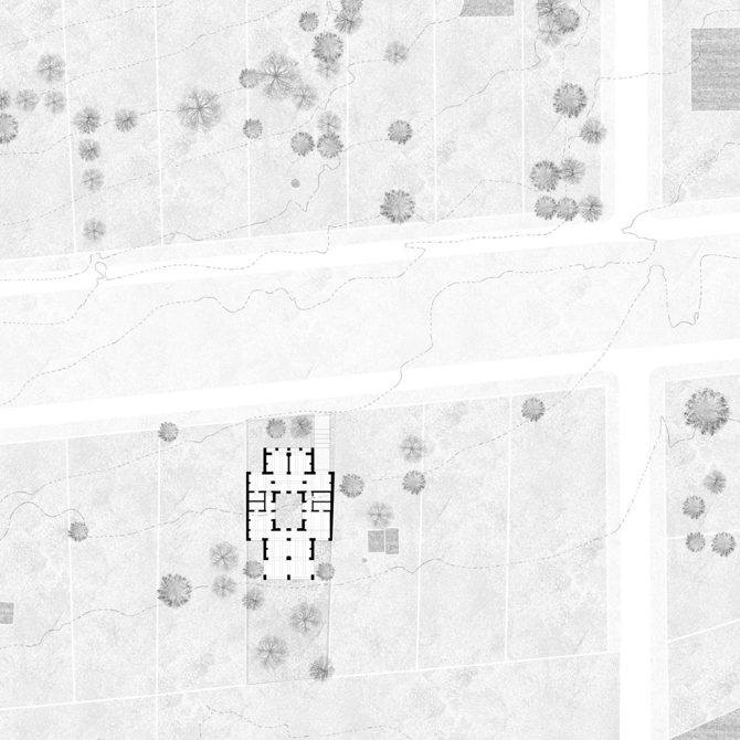 Un deambulatorio ocupa el perímetro del patio y conecta las diferentes habitaciones. Este deambulatorio es intencionadamente alto y está rematado por unos pequeños lucernarios que gracias al efecto chimenea provocan la circulación vertical del aire. La propuesta se adapta al salto topográfico que existe entre la parte anterior y posterior del solar, minimizando los trabajos de excavación, definiendo diferentes relaciones con el patio y enriqueciendo el espacio interior.