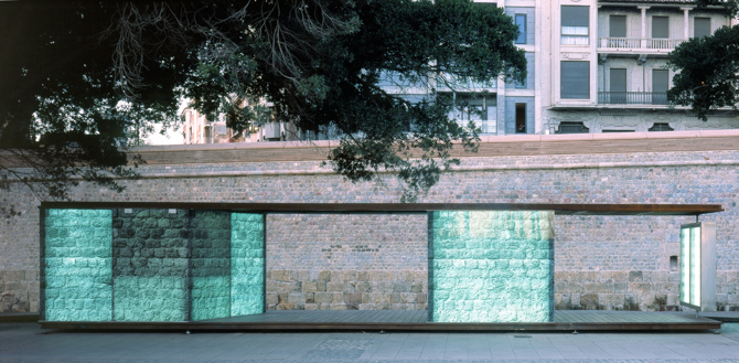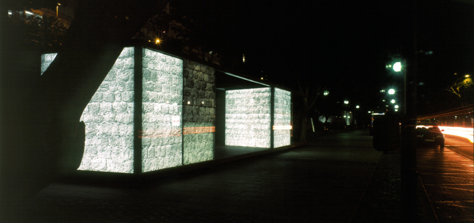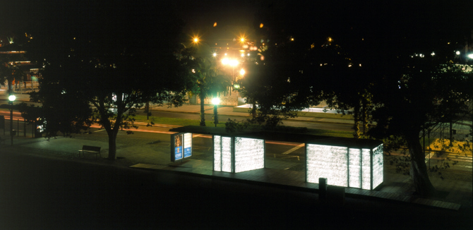 Tres piezas aisladas, levantadas con perfilería metálica que soportan vidrios laminados 6+6 mm serigrafiados y 256 tubos fluorescentes en total de 58 watios cada uno.