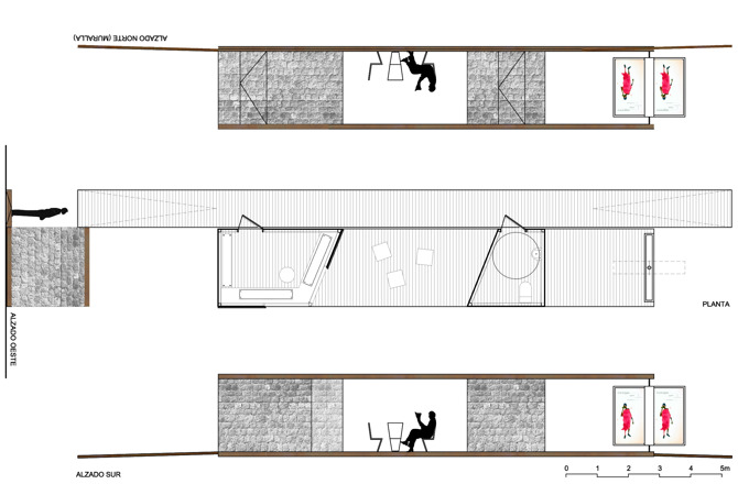 El escueto programa requerido se descompuso en dos pequeños volúmenes para crear un espacio intermedio entre piezas que introdujera el entorno de la actuación como una pieza más. Una búsqueda no solo en este planteamiento disperso, sino también en su resolución constructiva y en los materiales escogidos.