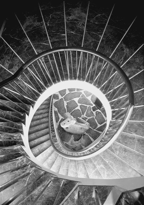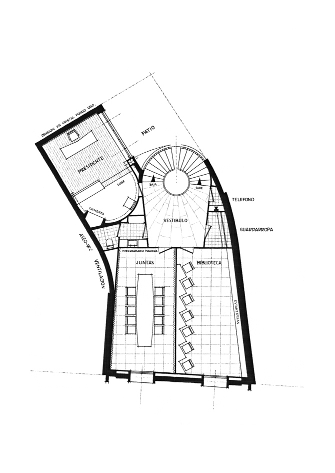 La planta baja cumple la función de vestíbulo principal desarrollando un vocabulario expresivo de planos donde la prolongación de perspectivas y la orientación de movimientos conllevan una entrada fluida, de dinamismo capturado, que se fuga hacia la escalera de subida.
