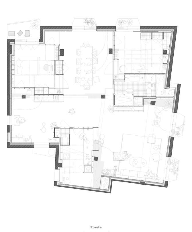 El soporte es un piso de los años 60 dentro del casco antiguo de Palma. Un piso vacío, sin divisorias, fruto de un anterior intento de reforma. Un piso desnudo. Las únicas preexistencias son meramente constructivas: estructura, cerramiento perimetral y bajantes.